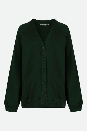 Self coloured button front cardigan with ribbed welt and cuffs and topstitch detail to strengthen seams.