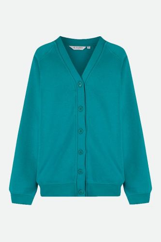 Self coloured button front cardigan with ribbed welt and cuffs and topstitch detail to strengthen seams.